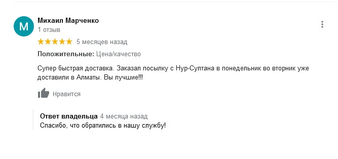Супер быстрая доставка. Заказал посылку с Нур-Султана в понедельник во вторник уже доставили в Алматы. Вы лучшие!!!